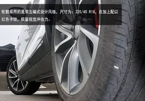 輪轂采用的是雙五幅式設計風格,尺寸為:225/45 R18,在加上配以紅色卡鉗,極富視覺沖擊力。