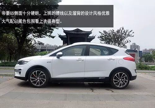 帝豪GS側面十分硬朗,上挑的腰線以及溜背的設計風格優雅大氣配以黑色包圍看上去很有型。