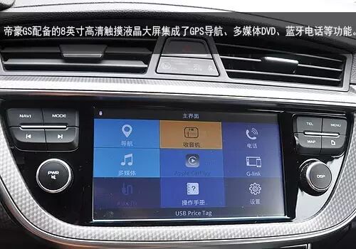 帝豪GS配備的8英寸高清觸摸液晶大屏集成了GPS導航、多媒體DVD、藍牙電話等功能,并具有手機互聯功能。
