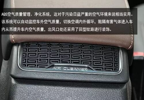 AQS空氣質量管理、凈化系統,這對于污染日益嚴重的空氣環境來說相當實用。該系統可以自動監控車外空氣質量,切換空調內外循環,阻隔有害氣體進入車內從而提升車內空氣質量,出風口處還采用了回型紋路進行裝飾。