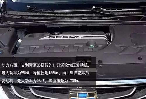 動力方面,吉利帝豪GS搭載的1.3T渦輪增壓發動機,最大功率為95kW,峰值扭矩185Nm;而1.8L自然吸氣發動機,最大功率為98kW,峰值扭矩為170Nm。變速箱方面將搭載6速干式雙離合和6速手動變速箱。1.3T渦輪增壓發動機動力儲備不錯,不論是中段加速還是起步加速表現良好。