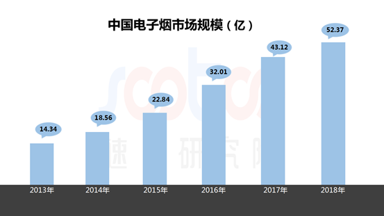 從國(guó)家分布上看,電子煙市場(chǎng)主要集中在歐美等國(guó)家,其中美國(guó)占據(jù)了46%左右份額,而我國(guó)雖然作為全球最大的電子煙生產(chǎn)基地,但消費(fèi)市場(chǎng)較低,不足6%。對(duì)比歐美國(guó)家的滲透率,市場(chǎng)還有待開(kāi)發(fā)。2018年我國(guó)電子煙市場(chǎng)規(guī)模為52.37億,未來(lái)隨著更多創(chuàng)業(yè)者的加入與推廣,市場(chǎng)規(guī)模還會(huì)進(jìn)一步擴(kuò)大。