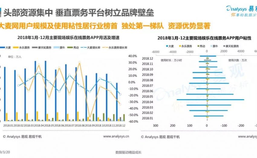 2019年3月20日,易觀發布《2018中國現場娛樂票務市場年度綜合分析》(以下簡稱“報告”)。報告顯示,2018年大麥網APP端月均活躍人數達237.3萬人,月均使用次數達2165.4萬次,月均使用時長89.9萬小時,從用戶規模和使用粘性上均居行業榜首,遠高于永樂、摩天輪、票牛、秀動、貓眼其它票務平臺總和,獨處第一梯隊,在市場充分競爭的情況下,為內容方、場館和用戶等生態相關方提供著獨一無二的現場綜合服務。