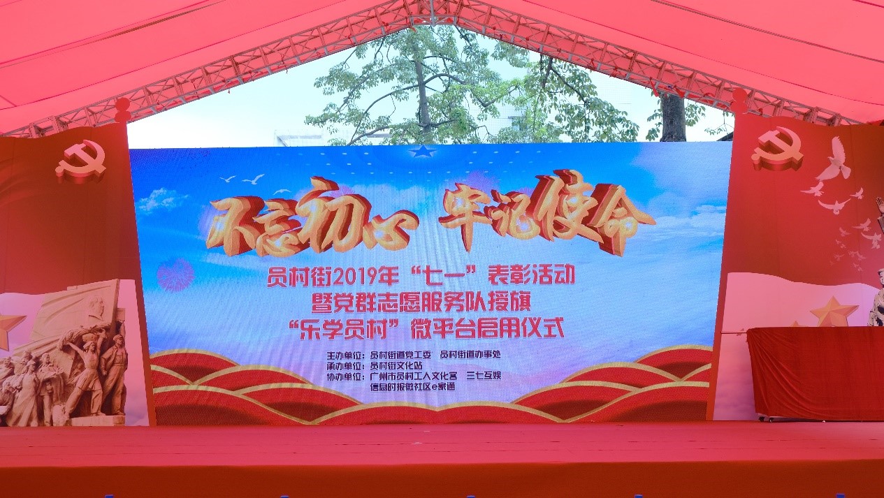 為紀念中國共產黨成立98周年,鞏固和擴大新時代文明實踐學習和活動成果, 6月27日,廣州天河員村街道黨工委舉辦了員村街2019年“七一”表彰活動暨黨群志愿服務隊授旗、“樂學員村”微平臺啟用儀式。