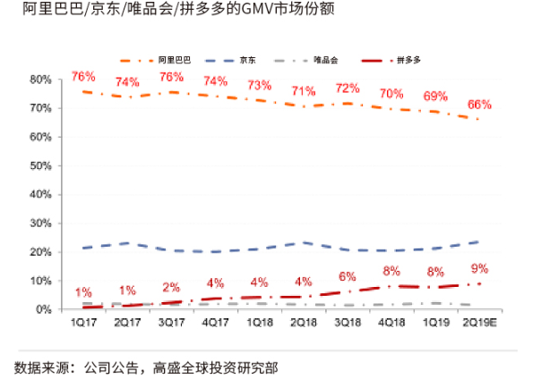 結(jié)合平臺(tái)在618大促期間超過300%的GMV同比增幅,高盛預(yù)測,拼多多在2019年Q2的GMV將同比上漲152%至2080億元人民幣,這一增長占電商行業(yè)GMV總增長的28%。拼多多GMV的市場份額占中國電商市場總份額的比例也將籍此上漲至9%。