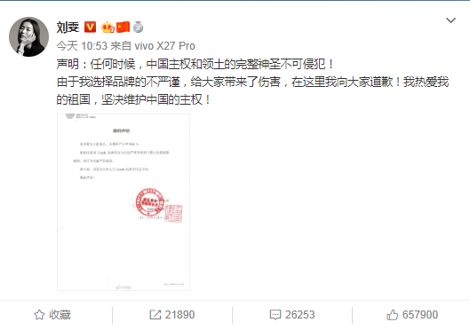 此前,Coach代言人劉雯在微博發布聲明,稱任何時候,中國主權和領土的完整神圣不可侵犯!并終止與Coach的代言合作。