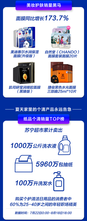 生活中不僅有遠方的田野,還有眼前的變漂亮和變干凈。數據顯示,18日0點-20點,蘇寧超市面膜銷量同比增長173.7%。而自7月22日0點-8月18日18點,蘇寧超市累計賣出了1000萬公斤洗衣液、5960萬包抽紙和100萬升洗發水。