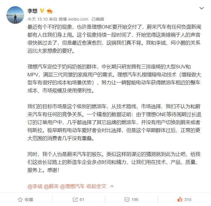 速途網8月19日消息(報道:李楠)今日,針對近期蔚來汽車負面新聞,汽車之家創始人、車和家CEO李想在微博發文稱,或因理想汽車將交付,蔚來汽車的負面新聞都被人往自己身上甩,并于近期越演越烈。李想表示,這鍋我們真不背。我和李斌?、何小鵬的關系遠比大家想象的要好。
