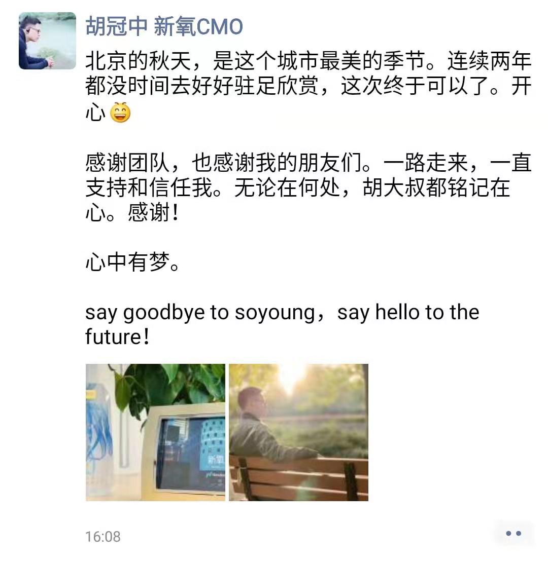 速途網(wǎng)10月25日消息(報(bào)道:李楠)今日,新氧CMO胡冠中發(fā)布朋友圈宣布,因個(gè)人原因已正式辭去新氧CMO一職。