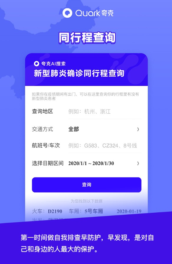 速途網訊 日前,夸克推出“新冠肺炎確診同行程查詢”功能,公眾可根據“地區”、“交通方式”、“車次”、“日期”等多種方式,在夸克APP和支付寶進行查詢。幫助公眾便捷、及時了解信息,夸克精準高效呈現權威發布的疫情動態,提供疫情防控功能,助力科學防控,共同抗擊疫情。(李楠)