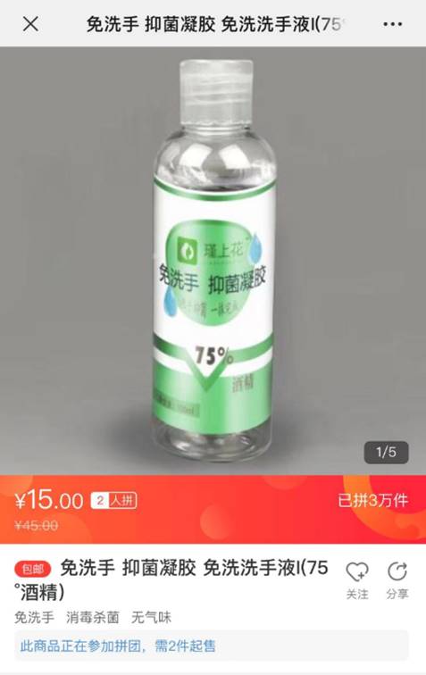 春節(jié)假期進(jìn)入尾聲后,有少部分工廠陸續(xù)復(fù)工。其中有一家來(lái)著于蘇寧“拼工廠”的河北企業(yè)與蘇寧拼購(gòu)?fù)献鳎_(kāi)足馬力,全力生產(chǎn)酒精含量為75%的免洗手抑菌凝膠。據(jù)蘇寧拼購(gòu)相關(guān)負(fù)責(zé)人介紹:“蘇寧將根據(jù)最近疫情消費(fèi)數(shù)據(jù)指導(dǎo)該‘拼工廠’生產(chǎn),預(yù)估未來(lái)幾天銷(xiāo)量,讓工廠效率達(dá)到最大。”據(jù)悉,該款“75%免洗手抑菌凝膠”商品僅2月2日上半日便拼出3萬(wàn)單。河北“拼工廠”負(fù)責(zé)人表示,目前產(chǎn)能能達(dá)到日均20萬(wàn)瓶。