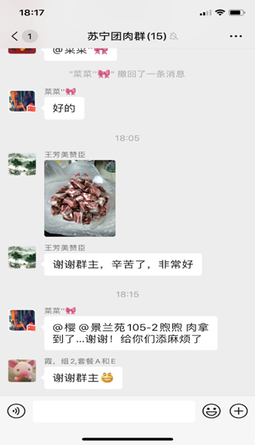 如此一溝通,居民與鮮肉供應商之間便搭起了蘇寧小店這座橋。胡玉玲根據社區微信群的團購情況,每天向供應商提供鮮肉需求,供應商將鮮肉運至社區的蘇寧小店,胡玉玲再組織小店店長,一起將各小區的肉配送過去。而且在居民領肉時,胡玉玲事先讓大家準備好紙,在上面寫上自己購買的肉品明細,領肉時大家間隔一兩米,只憑紙上的字便可取肉,全程無接觸。