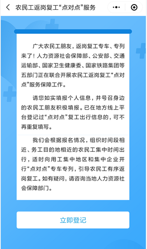 進(jìn)入小程序或返崗復(fù)工頁(yè)面后,閱讀“點(diǎn)對(duì)點(diǎn)”服務(wù)說(shuō)明后,農(nóng)民工點(diǎn)擊立即登記就可以錄入自己的個(gè)人信息。