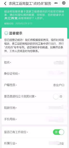 為了保障農(nóng)民工以及同行車(chē)輛乘客的健康,信息填寫(xiě)的第一步就是“健康核驗(yàn)”,系統(tǒng)基于國(guó)家衛(wèi)健委共享的可能密切接觸者、確診和疑似病例數(shù)據(jù)進(jìn)行核驗(yàn),個(gè)人健康狀態(tài)未見(jiàn)異常的農(nóng)民工才可繼續(xù)進(jìn)行需求填寫(xiě)。