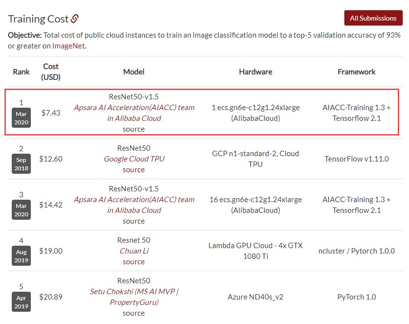 斯坦福大學(xué)DAWNBench是人工智能領(lǐng)域最權(quán)威的競賽之一,它是衡量深度學(xué)習(xí)優(yōu)化策略、模型架構(gòu)、軟件框架、云和硬件等綜合解決方案實(shí)力的標(biāo)準(zhǔn)之一。在圖像識(shí)別(Image Classification on ImageNet)榜單中,阿里云包攬了訓(xùn)練時(shí)間、訓(xùn)練成本、推理延遲以及推理成本四項(xiàng)第一,打破了谷歌等企業(yè)保持一年多的紀(jì)錄。