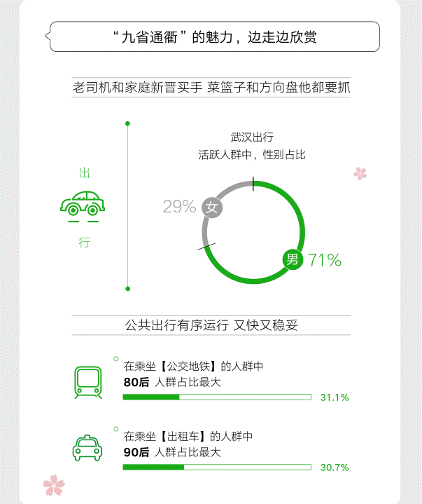 有序復工,交通出行也成為必備。公交地鐵出行中,80后成為更活躍群體,選擇乘坐出租車最多的是90后,講究效率和體驗。另外,3月25日-4月3日期間的數據顯示,每天上午11點是武漢人出行的高峰時段。