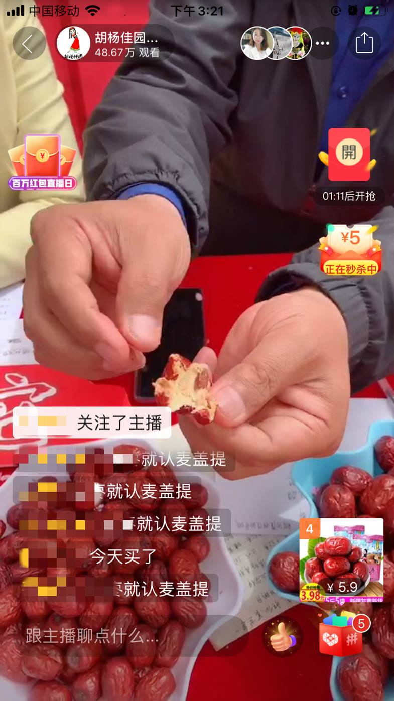 這位自編自唱、多才多藝的“主播”不是別人,正是新疆喀什地區麥蓋提縣委副書記、縣長艾尼瓦爾·吐爾遜。4月9日下午,艾尼瓦爾·吐爾遜來到拼多多直播間,為當地的特色產品麥蓋提灰棗代言??h長親自上陣帶貨,最終吸引了69萬拼多多網友的關注,包括麥蓋提灰棗在內的麥蓋提特產共計銷售出約43噸。