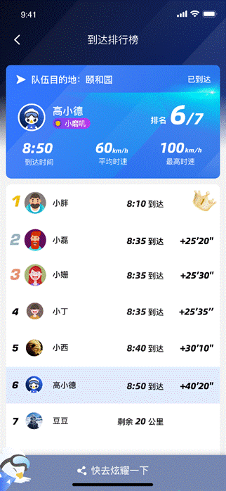 所謂游戲化動態排名,就是在組隊隊員共同去往目的地的路上,導航界面借鑒游戲化玩法,增加了隊員的實時排名情況顯示。當有隊友超過你時,排名會實時調整,強化出行中的互動性和趣味性。當你到達終點后,通過到達排行榜,能快速了解小伙伴的集合情況,以及自己在隊伍中的排名和稱號,還可以將此次出行的排名情況分享給好友。