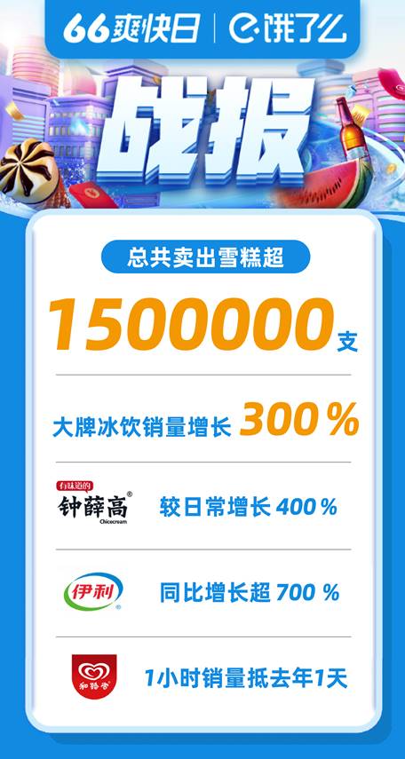 數據同時顯示,6月6日當天,餓了么上冰飲雪糕銷量同比去年增長了3倍,伊利、明治等冰飲品牌同比增長超過7倍,和路雪開賣1小時的銷量就超過了去年全天,創下新紀錄。