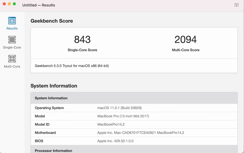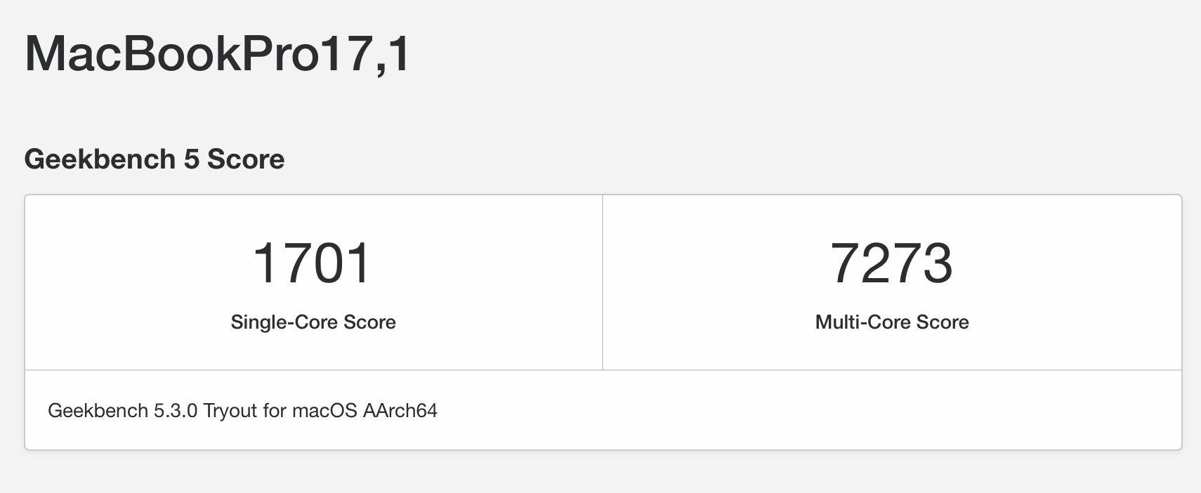 據(jù)了解,Apple M1采用臺積電5nm制程工藝的八核架構(gòu),大核心主頻達到了3.19GHz。在性能方面,搭載Apple M1處理器的MacBook Pro在GeekBench5單核成績1701、多核成績7273,即使在x86兼容模式下,單核成績也達到了1307、多核成績5327。相比筆者2017年款的雙核i5 MacBook Pro單核成績843、多核成績2094的成績幾乎是數(shù)倍的提升。?
