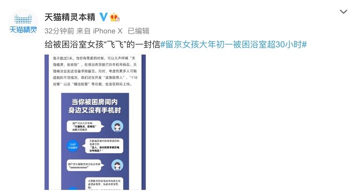 飛飛的遭遇也引起了社會大眾對于被困房間時如何自救的思考。 昨日,飛飛在今日頭條認證賬號中發表了補充說明,提到“天貓精靈沒辦法撥打110功能(蘋果系統),安卓系統可以綁定自己的通訊錄,關鍵時刻可以起到很大作用。”
