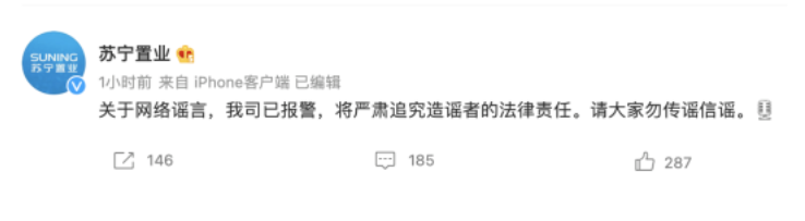 對此,蘇寧置業針對“破產”傳聞發布官方否認,回應稱:“關于網絡謠言,我司已報警,將嚴肅追究造謠者的法律責任。請大家勿傳謠信謠。”