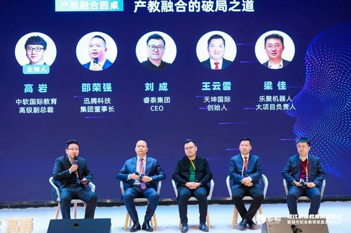 上市公司圓桌之后,是產(chǎn)教融合圓桌討論。在中軟國(guó)際教育高級(jí)副總裁高巖的主持下,迅騰科技集團(tuán)董事長(zhǎng)邵榮強(qiáng)、睿泰集團(tuán) CEO 劉成、天坤國(guó)際創(chuàng)始人王云雷、樂(lè)聚機(jī)器人大項(xiàng)目負(fù)責(zé)人梁佳,以《產(chǎn)教融合的破局之道》為主題,探討產(chǎn)教融合的新思路和新方法。