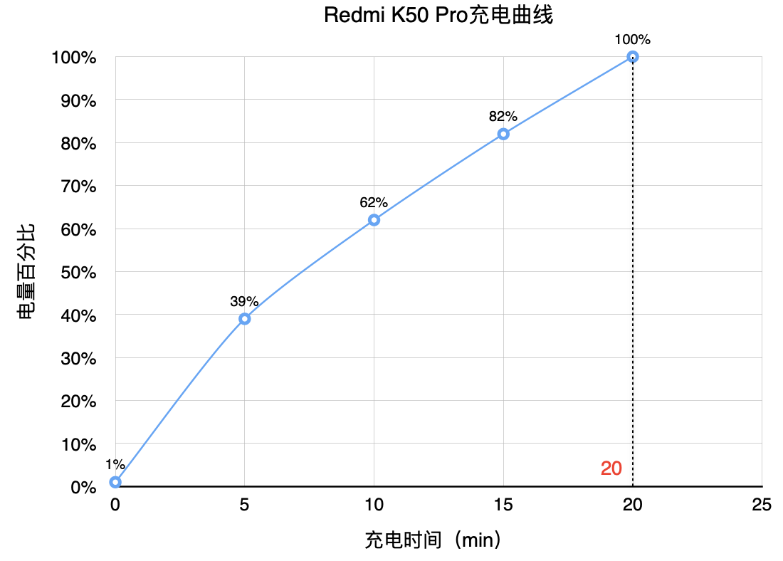 實測使用包裝內的120W原裝充電套裝為K50 Pro充電,1-100%僅需要20分鐘。