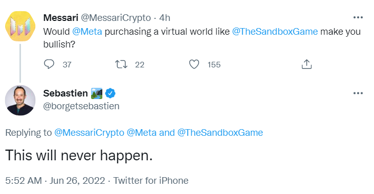 近日,The Sandbox 聯合創始人兼首席運營官 Sebastien Borget 在回應 Messari 有關“你是否看好 Meta 收購類似 The Sandbox 這樣的虛擬世界”的提問時表示,“這絕對不可能發生。”(速途元宇宙研究院)